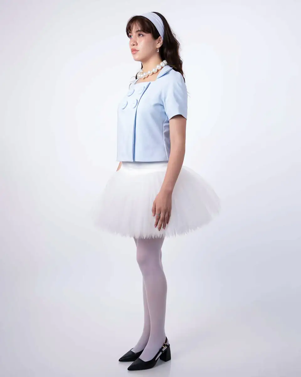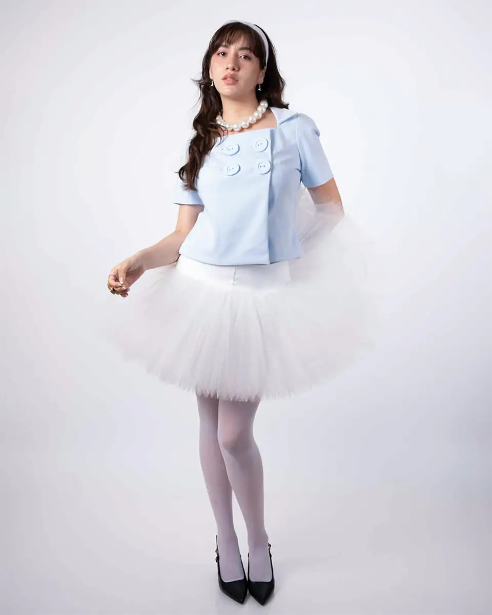Envíos a todo el PerúConfeccionado en Tela Benetton, tul ilusión funcionado con estructura plana y botones metalizados en la espalda.
